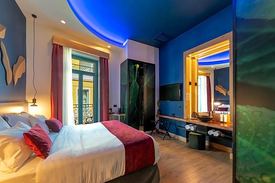 Room options span a wide range, from Standard Rooms to expansive suites. Notable choices include the Junior Suite (237 sqft), the Signature with 1 Queen bed and 2 Twin beds, and the Suite Jacuzzi designed for larger groups (accommodates 8 adults and 5 children). Also available are the Double Room, Sea View (accommodates up to 10 adults and 6 children), Premium Suite, Luxury Suite, and several city- or sea-view variants, all configured as non-smoking.