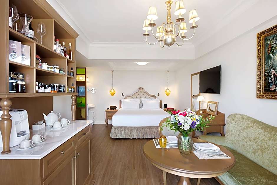 The Legacy Gastro Suites offers three types of rooms: V Suite Sea View, K Suite Sea View, and EL Suite Sea View. All rooms are suites with a room size ranging from 323 sqft to 344 sqft. Smoking is not allowed in any of the rooms. All rooms can accommodate 2 adults and 1 child and are equipped with a king-size bed.
