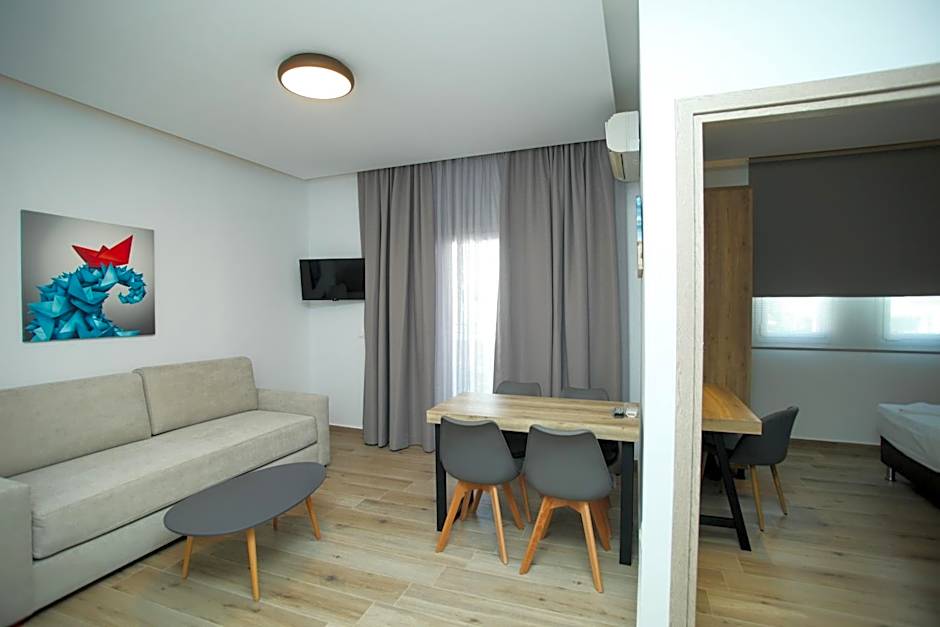 These elegantly appointed apartments offer beautiful views over the pools and the gulf of Kassandra. Please note that air conditioning is located in the living room and bedroom area.