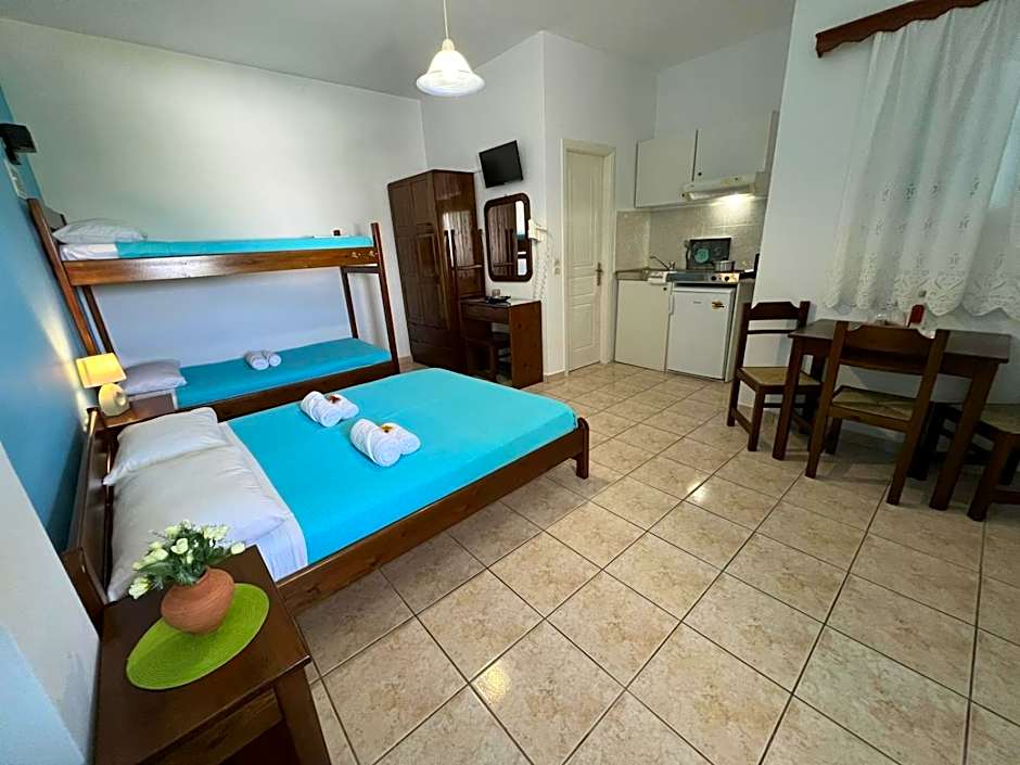 Air-conditioned studio with free Wi-Fi and a furnished patio or balcony with Aegean Sea and garden views. Features: -kitchenette with cooking rings, fridge and dining area. -seating area with TV -private bathroom with hairdryer
