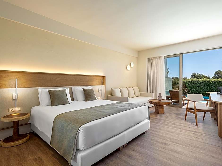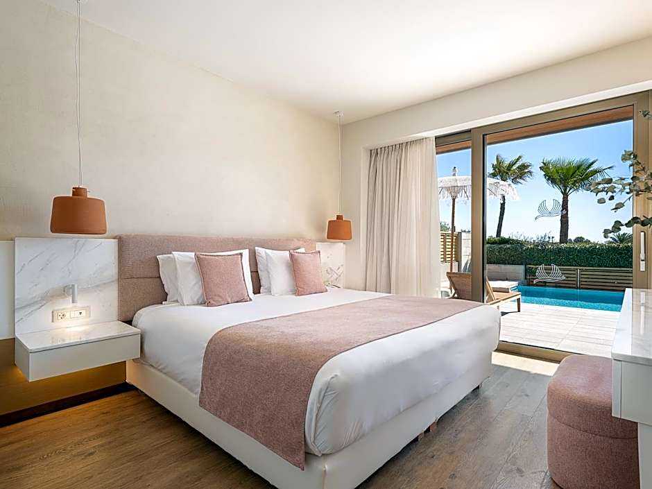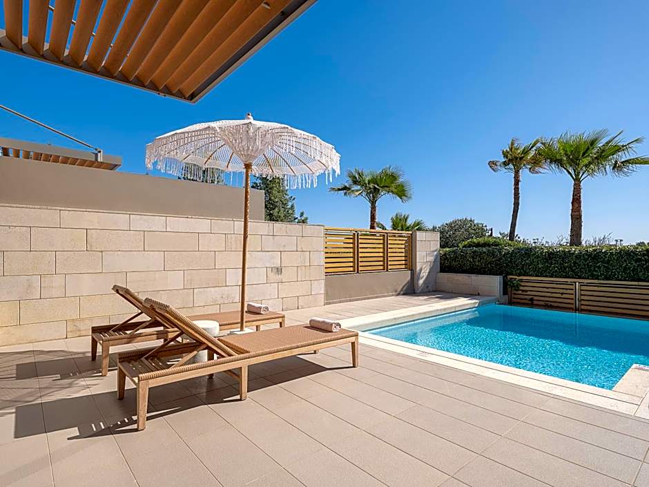Spacious and elegant room with private pool and sunbathing terrace. It consists of 1 bedroom with seating corner and flat-screen LED TV 26''. The luxurious marble bathroom comes with separate bath and rain shower, bathrobes and slippers. A pool towel service is provided at no charge during your stay.