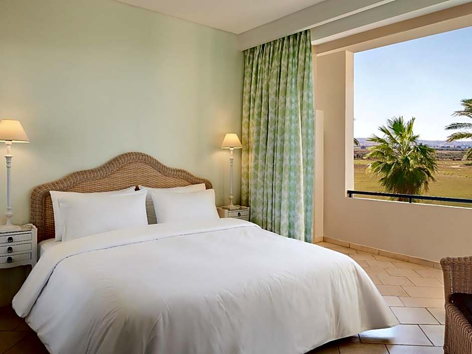 Dining options focus on flavor and family-friendly vibes: Main Restaurant serves Greek, International, and grill favorites, while Beach Taverna dishes up Greek and International options by the sea. A bar on site is ready for sunset sips, and fitness and tennis facilities are free for those keeping active. For extra help, babysitting, airport shuttle, and horseback riding can be arranged for a fee.