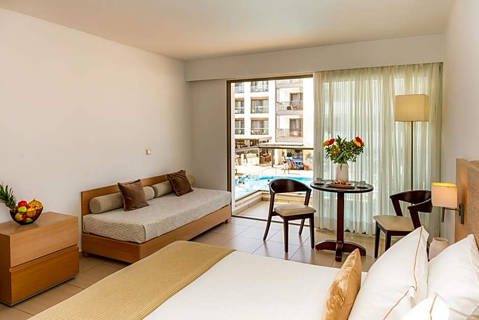 As you bask in the luxury of , be sure to satisfy your culinary cravings at one of its on-site restaurants. Start your day at the Mediterraneo, where traditional Greek and Mediterranean flavors come alive, awakening your taste buds with tantalizing dishes. For a romantic evening under the stars, head over to Daphne, where the ambiance is cozy and the meals are crafted to create perfect memories. If you're a family looking for a mix of fun and flavor, the Seaside Pool Snack Bar has you covered with international favorites that will delight both young and old alike as they fuel up on playful afternoons by the pool.
