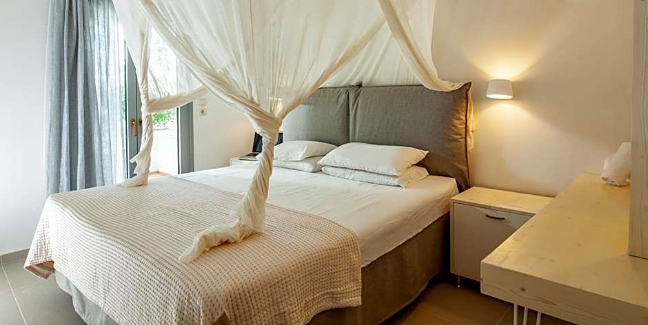 Οne bedroom maisonette comes with two floors and internal stairs, sea or garden view, max 4 people occupancy, kitchen with cooking stoves, coffee machine, tea amenities, kettle, cutlery, cups and plates, a dining table, living room with plasma TV 32” and balcony or terrace.