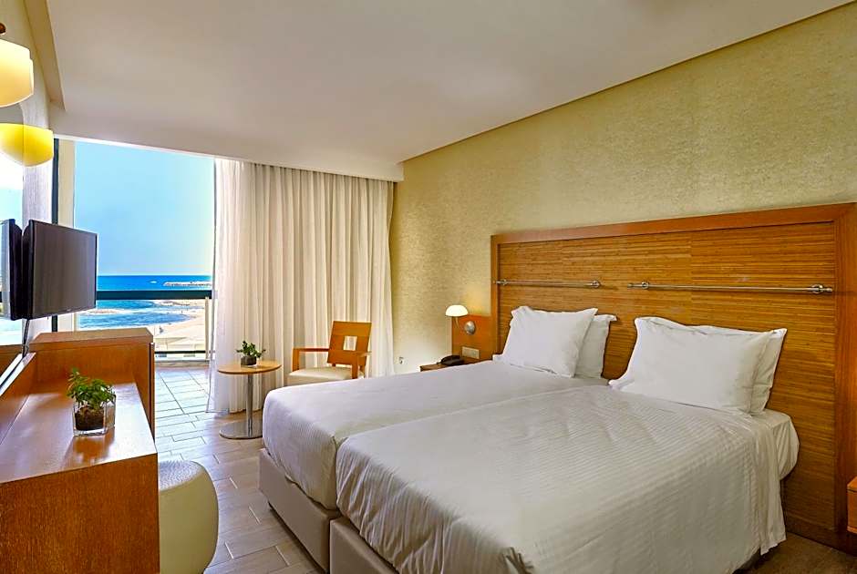 Modern room offering a furnished balcony with panoramic sea views. It includes air conditioning, satellite TV, fridge and hairdryer.