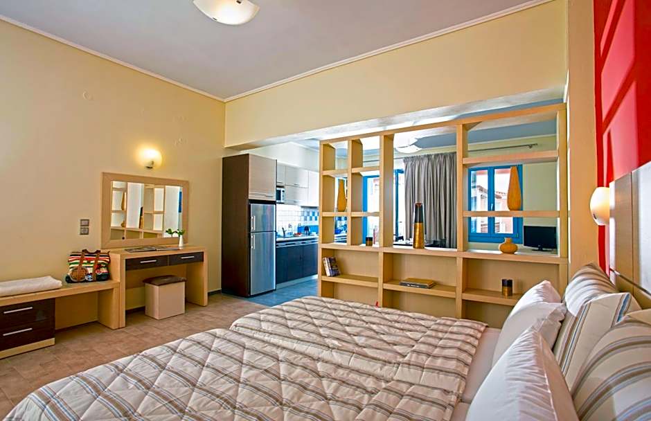 Consists of a twin bedroom and a living area with a sofa bed, coffee and dining tables as well as a fully equipped kitchen. All studios offer views and have a furnished, balcony or a terrace which is shaded by traditional pergolas.