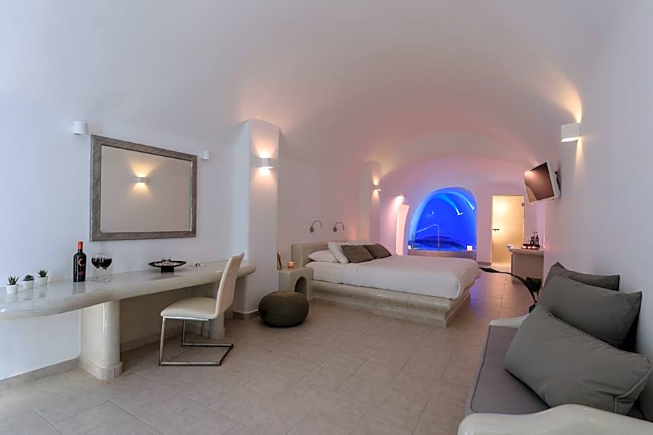 Featuring a private, heated plunge pool and a spa bath, this elegantly decorated and air-conditioned suite opens to a furnished balcony with Aegean Sea and volcano views. It offers: -2 extra large beds in an open-plan area -a seating area with flat-screen, satellite TV -a mini-bar -a private bathroom with free toiletries and bathrobes -free WiFi.