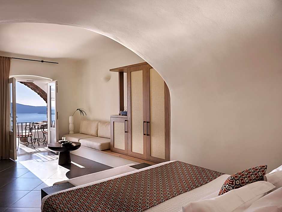 The Honeymoon Suite is highly suggestive with its open-plan style that features a bathroom with shower, a living and dining area and a bedroom with king size bed offering Caldera view. An outdoor jacuzzi is set at the balcony with lounge chairs for sunbathing sessions.