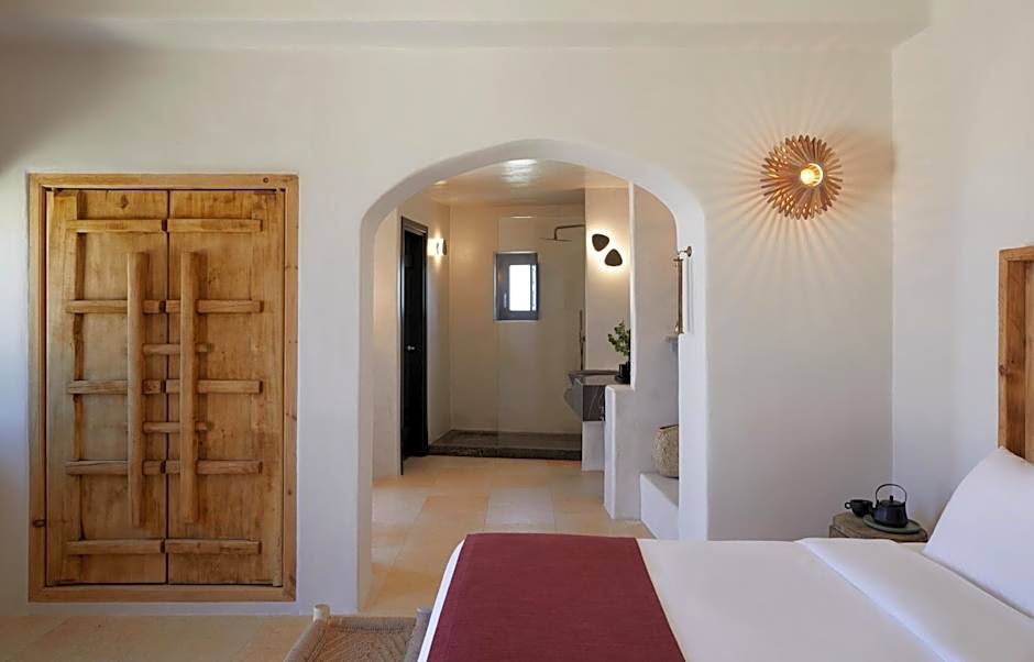 This cave-style suite has a built-in king-size bed and an impressive cage cellar to enjoy fine-labeled wines. It also features an open-air shower, luxury amenities, slippers, air conditioning, and complimentary WiFi. Its outdoor terrace with an inner courtyard view and a partial sea view features an outdoor private heated pool complete with jets for extra relaxation. It is equipped with outdoor furniture and a comfy double sunbed. Residents have also access to the main lounge area with the common infinity pool and pool bar.