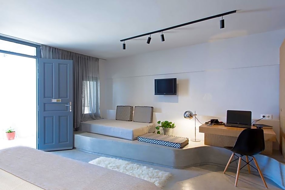 Volcano Sea View Studios with outdoor Jacuzzi is 323 square feet and includes either a double bed 131-150 width or a single bed 80-130 width plus living room, balcony, hairdryer, ironing set, safe, and slippers.