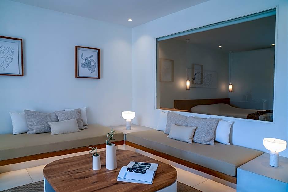On Mykonos' Main Street, just from the city center, lies an adults-only, four-star retreat that blends island charm with modern comfort. A seasonally open outdoor saltwater pool invites a refreshing dip, while spa and wellness packages unwind tired travel legs. In the evenings, free live music performances set a relaxed, celebratory mood, complemented by reliable free WiFi to share the moment.