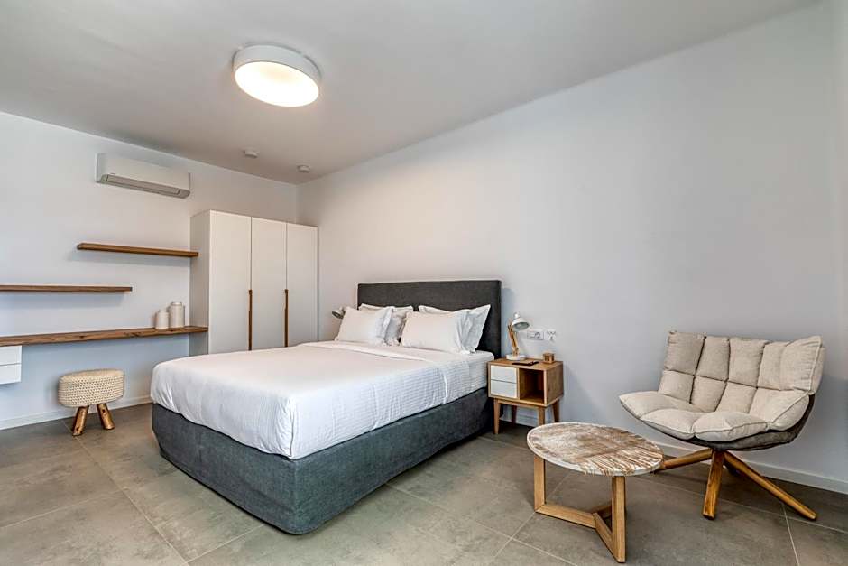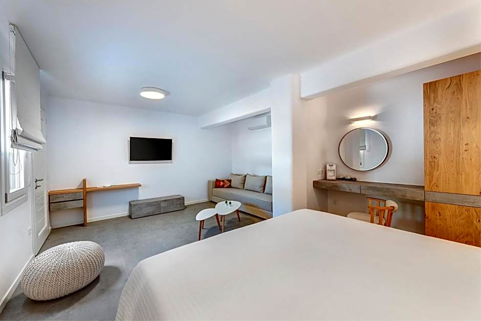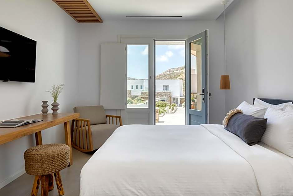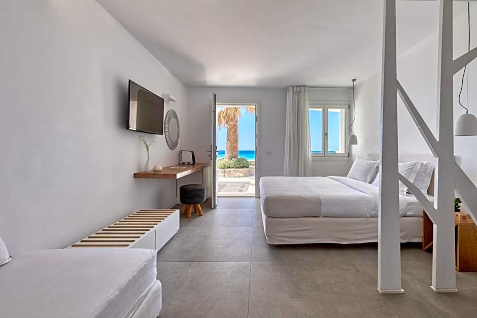 Located right on the sandy beach of Elia, this suite is fitted with Coco Mat down pillows and a Coco Mat queen-size bed. It has a private terrace on the back yard and features: -air conditioning -a fridge -a safe -a flat-screen TV -free WiFi.