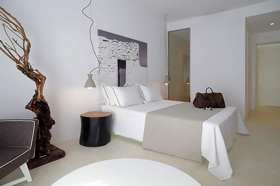 The white-washed Junior Suite, decorated with earthy tones and wooden elements, is located on the upper level of the hotel. It includes a living room and a 32” TV and opens out to a furnished private balcony overlooking Mykonos Town and the sea.