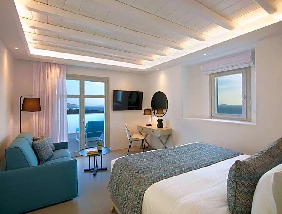 This comfortable suite includes a living room with 1 or 2 sofas. It is elegantly decorated with rich color schemes that complement the traditional Cycladic style of the hotel. Free Wi-Fi is available.