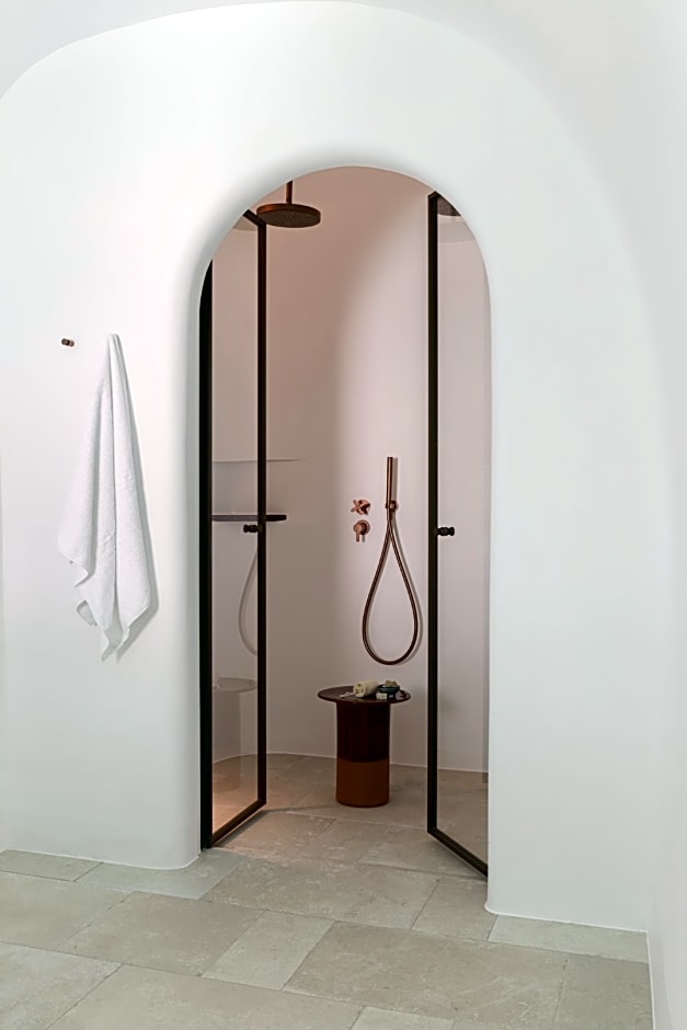 The River pool suite features a magnificent bedroom with separate living room and a bathroom with a rain shower. The highlight of the suite is the river pool plunge pool where you can have your Santorini cave moments and relish the endless views.