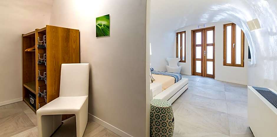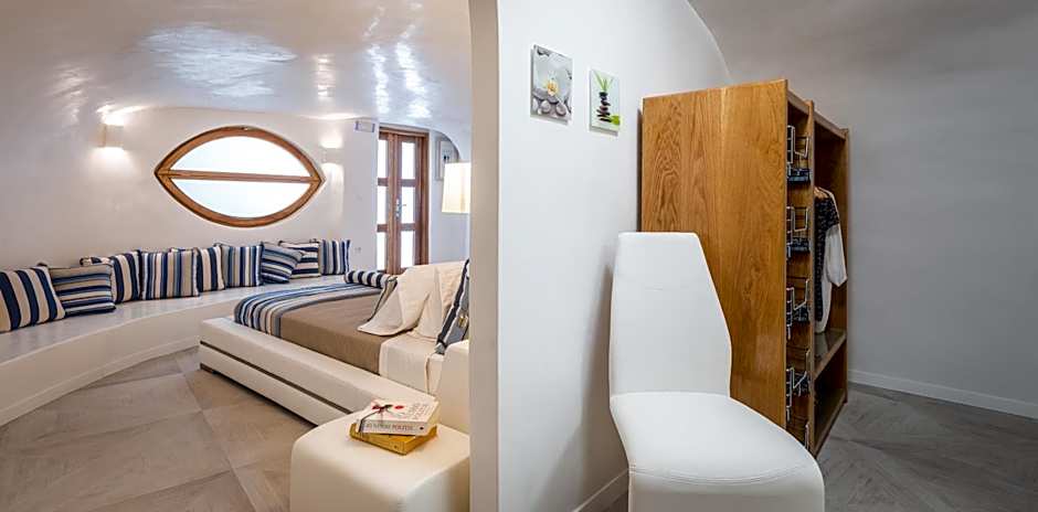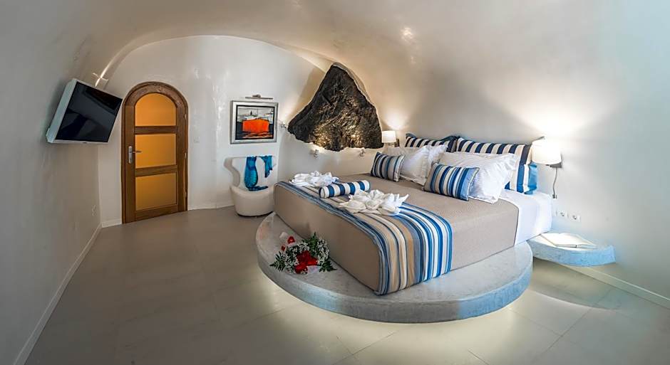 This one-bedroom cave-style suite of 60 square yards, features a spacious living room with a fully equipped kitchen, as well as a walk-in closet. It includes a king-size bed, and 2 bathrooms with a built-in shower. It offers unobstructed Caldera and Aegean Sea views from its private balcony or terrace, together with a private, heated infinity pool.