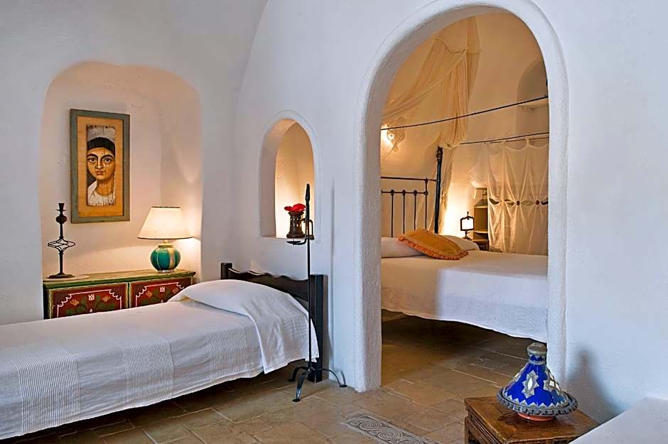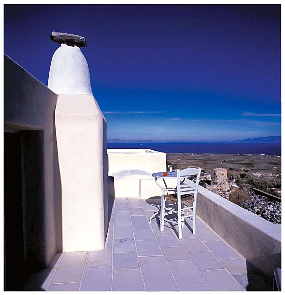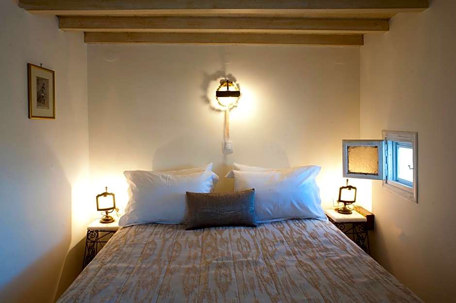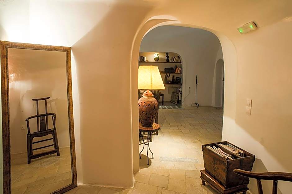 An open-plan suite with a cave bedroom, an antique dining room and a cement bathroom. This suite has access to a small path that leads to Oia.