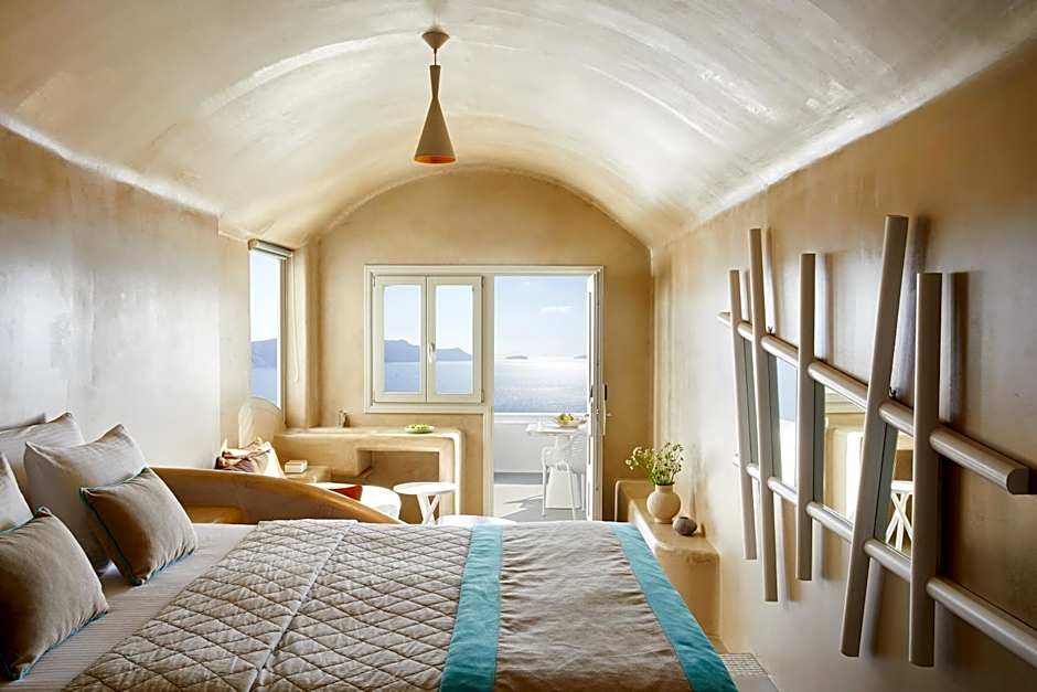 This deluxe suite opens to a terrace with a private pool and views over the Caldera, the Volcano and the Aegean Sea.