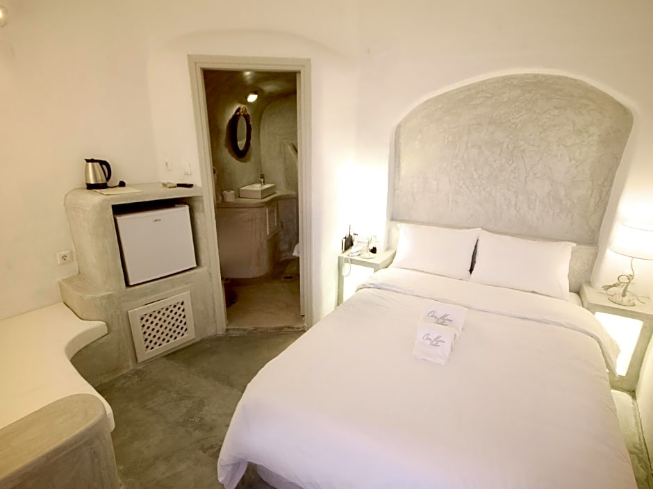 Room options span a wide spectrum, including Standard Studio, Suite, Honeymoon Cave Suite, Cave Superior Studio, Suite with Hot Tub, Superior Studio, Room With Sea View, Luxury Villa, Honeymoon Suite, and more, with Caldera View or Sea View variants available. Payment is accepted in cash as well as American Express, Mastercard, and Visa.