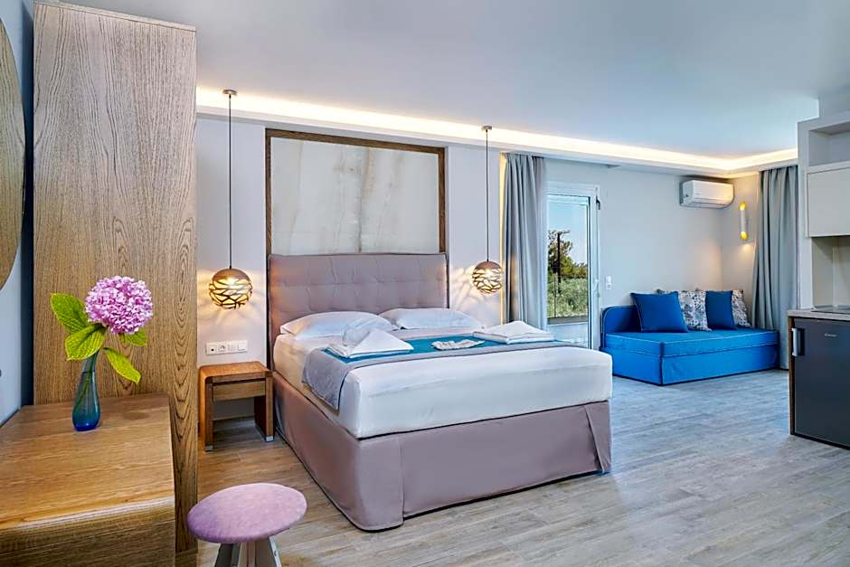 Address: 64 Dimitriadou, Thásos, Greece. This 4-star aparthotel has 166 reviews. Room options include Deluxe Suite, Superior Suite, Quadruple Room (Sea View), Apartment (2 Bedroom), Studio (Queen), Triple Room (Sea View), and Family (Sea View), all non-smoking.