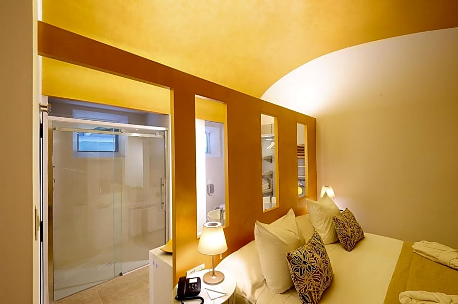 Fitted with wooden floors, beamed ceilings and stone walls, this junior suite has an open-plan bedroom with seating area featuring a fireplace and a hot tub. It also includes a kitchenette and a bathroom with shower cabin.