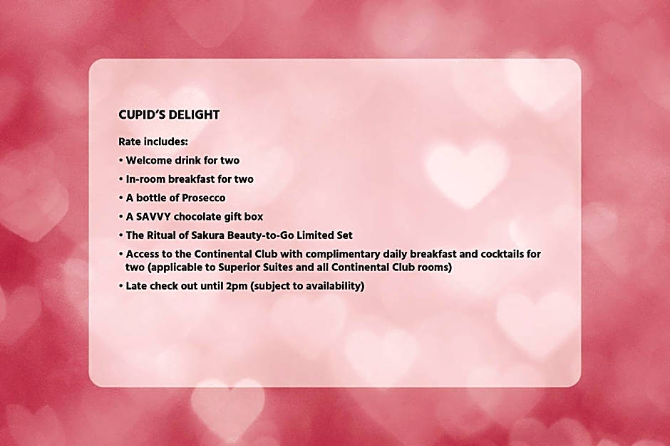 Offers Continental Club access which features free daily breakfast and evening cocktails with Hors d’oeuvres. Coffee and tea is available throughout the day in the club lounge.