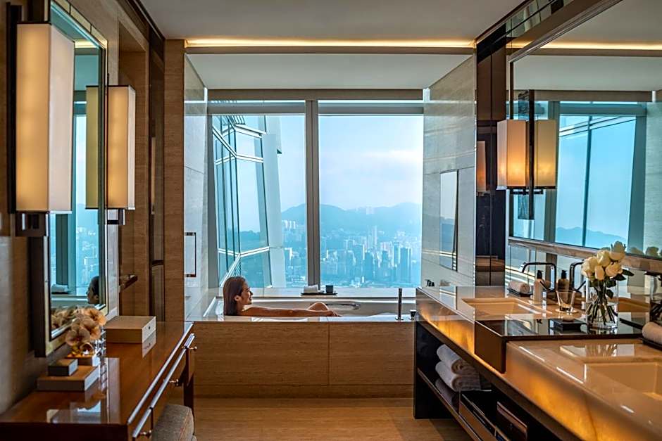 Located on floors 106 through 110 this suite offers panoramic views of the Victoria Harbor and Hong Kong Island. It features a spacious living and study area, a marble bathroom equipped with a 17-inch LCD TV, premium bathroom amenities, oversize bathtub and separate shower. It also comes equipped with a 42-inch LCD TV and 24-hour Club Lounge access.