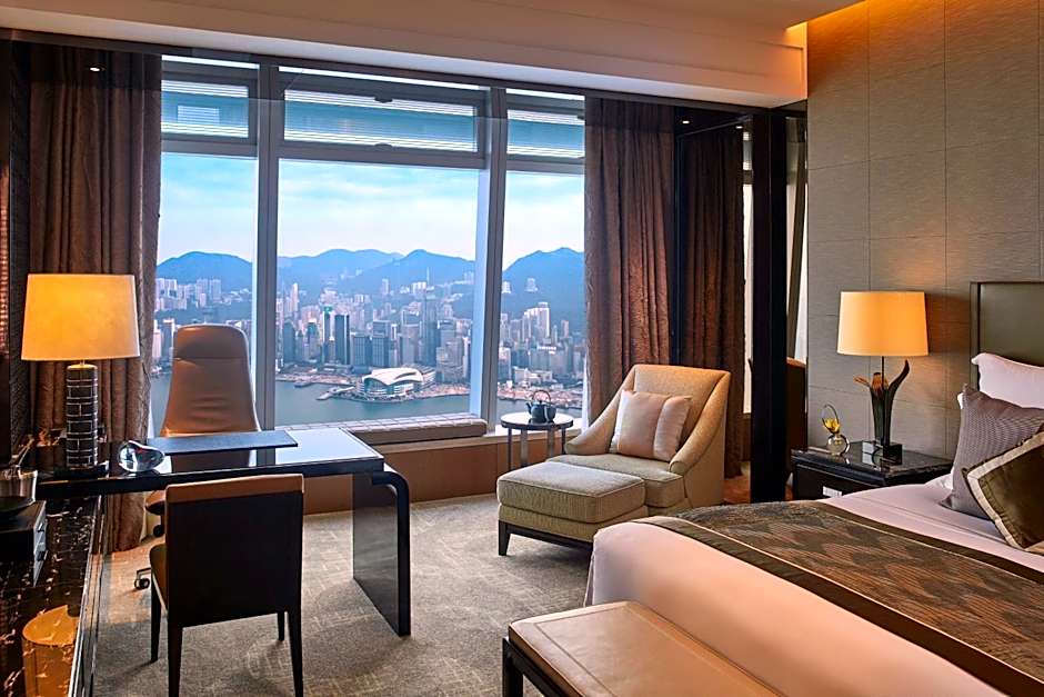 Premier Executive Suites offering panoramic views of Victoria Harbor, with 24-hour access Club Lounge. This room features marble bathroom with a 17-inch LCD TV, separate bathtub and shower with premium bathroom amenities, and also includes a 42-inch LCD TV.