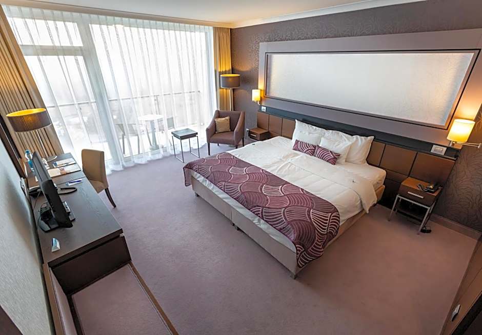 Guests at Aquaworld Resort Budapest can spend their time enjoying leisure amenities such as the water park, spa/wellness packages, and fitness center. The outdoor and indoor swimming pools, including those specifically for kids, are available year-round, some heated and all with various restrictions and features. The hotel's Duna Restaurant offers international cuisine with a modern, family-friendly ambiance, providing a convenient option for dining on-site. Moreover, the hotel features a bar for a relaxing evening. Additionally, the hotel offers a kids' club and babysitting/child services, making it an ideal place for families. With 24-hour front desk, room service, and a variety of room features such as balcony and private bathroom, guests have everything they need for a comfortable and enjoyable stay at the hotel.