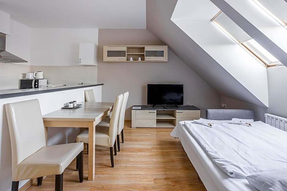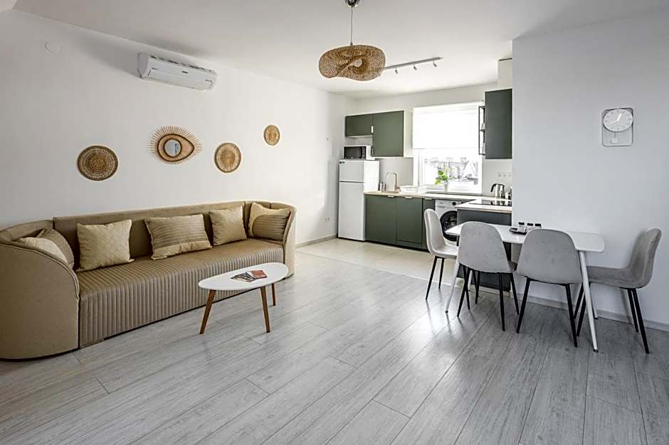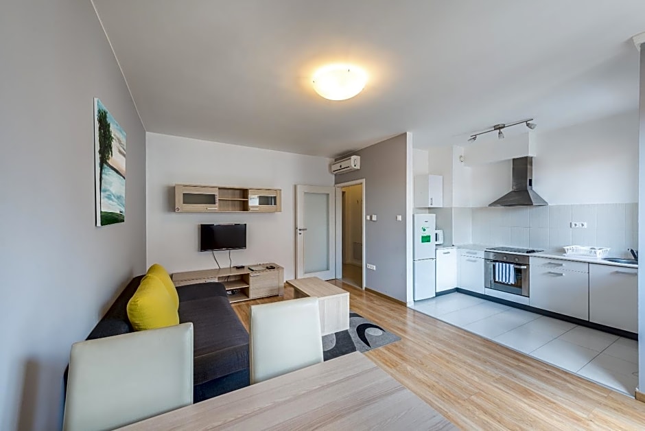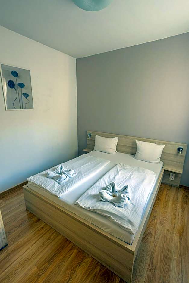 The 50 m2 Deluxe One-Bedroom Apartments can accomodate maximum 2 person. These apartments are offered for those guests who would like to spend their holiday in a modern, designed and a little better equipped apartment, than a simple one. The apartment is modern, freshly renovated. In the American style kitchen you can find coffee machine with free and unlimited coffee consumption. The modern designed bathroom comes with washing machine, hairdryer and a comfortable built-in spinkler shower.
