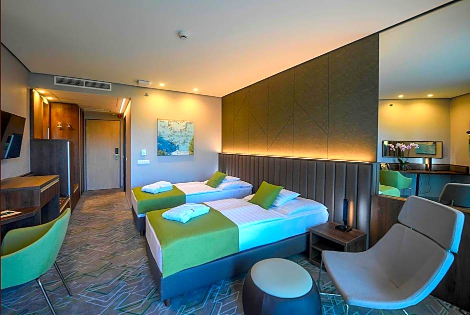 The Hunguest Hotel Sóstó offers Standard Double Rooms with twin beds and Superior Double or Twin Rooms with either twin or double beds. Both room types have a size of 323 sqft and do not allow smoking. The Standard Double Room accommodates 2 adults, while the Superior Room can accommodate 2 adults and 1 child.