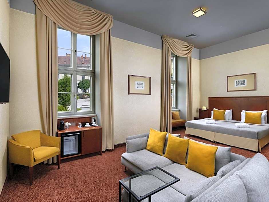Nestled just 0.4mi from Székesfehérvár's vibrant city center, the Mercure Szekesfehervar Magyar Kiraly offers a fantastic four-star escape that combines comfort with convenience. Starting at a minimum of approximately 97 euros, this pet-friendly gem invites travelers to enjoy a range of fantastic amenities, including complimentary WiFi, a soothing sauna, and a fitness center perfect for keeping up with your workout routine. The hotel's elegant soundproof rooms ensure a peaceful stay, whether you're here for leisure or business, and the charming terrace and sun deck are ideal spots to unwind after a day exploring the local sights.