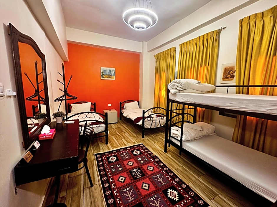 This room features bright, modern decor and shared bathroom facilities.