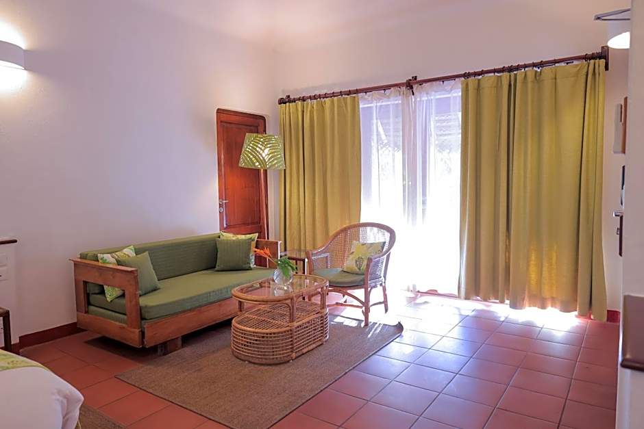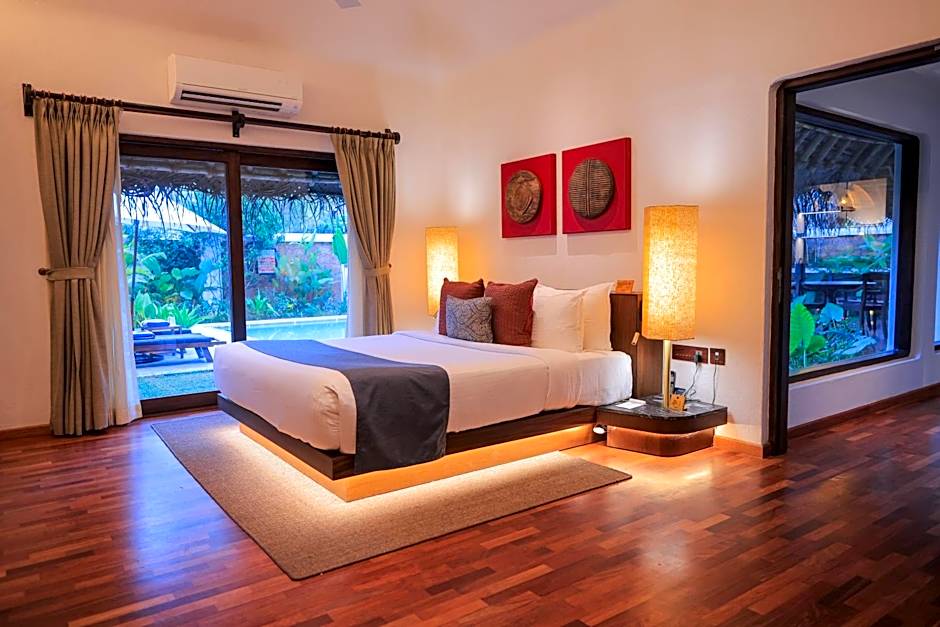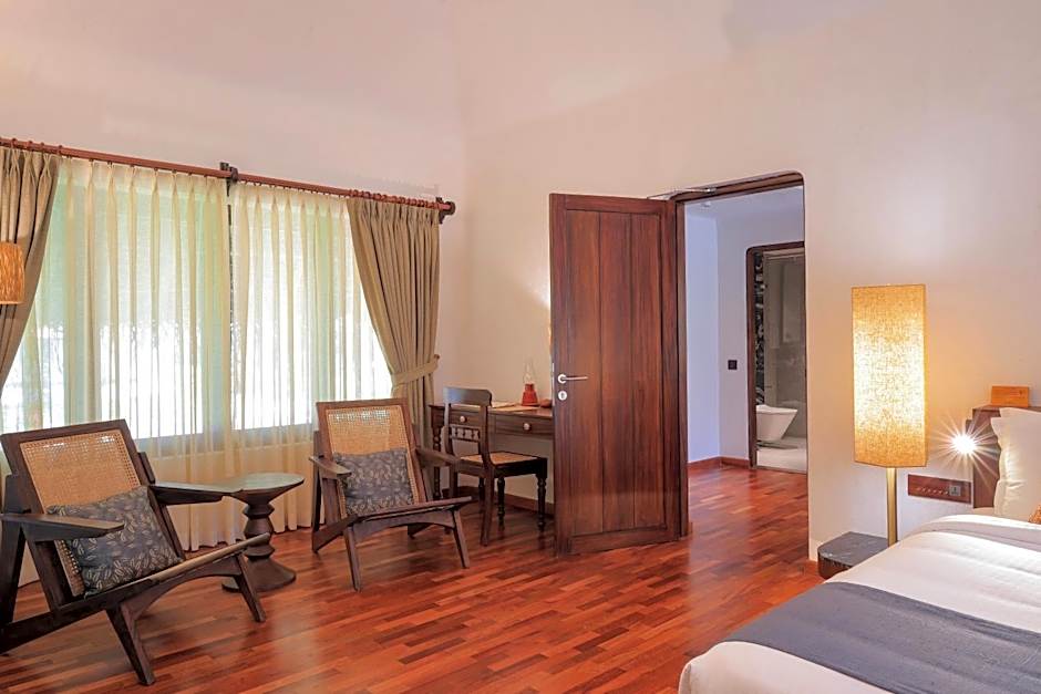 The deluxe pool villas are all large bedded. It has a separate living room, a spacious bedroom, a passage, a private sit out, a closed bathroom and one bathroom opens up to the sky. It has a much larger private pool with a garden. One of the Deluxe Pool Villas is specially designed for those with special needs; it is a wheel chair friendly room with no steps, and has railings in the bathroom etc.