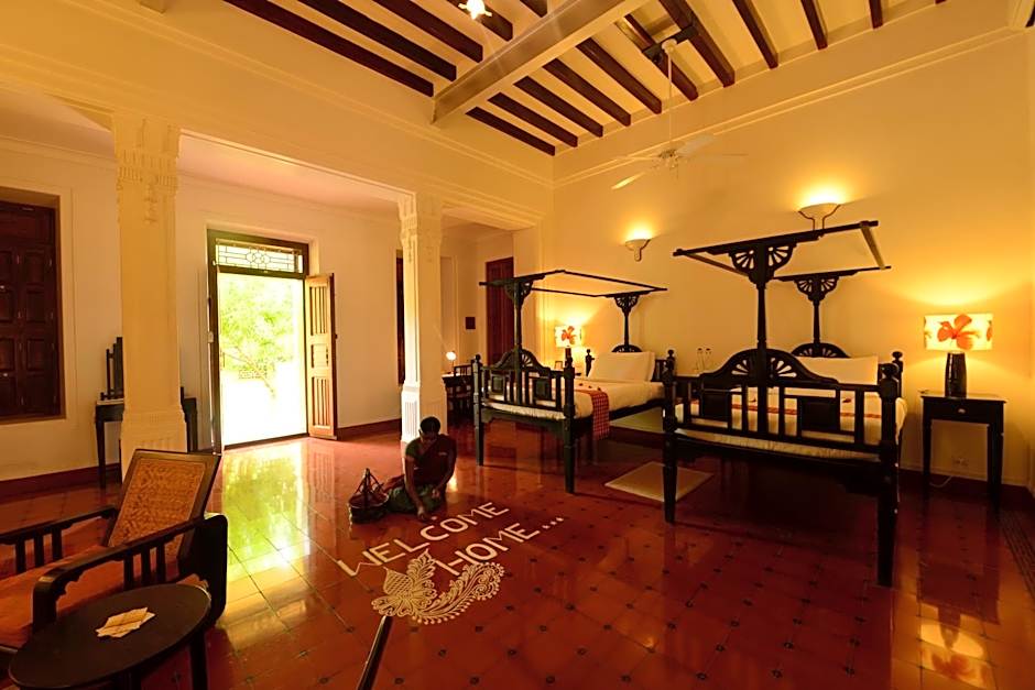 This room has high ceilings and polished windows, along with floors and walls inlaid with the famous Aathangudy tiles that are handmade to this very day. This is a space where one can experience the subtle elegance of history, where even the bed linen is handcrafted. Few rooms are equipped with a charming balcony overlooking the garden, and each room has an attached bathroom.