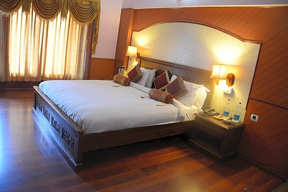 Room options include Bungalow and Studio for two adults (smoking not allowed), a Suite at 334 sqft with a Queen bed accommodating two adults and one child, a Superior Double Room at 205 sqft with a Queen bed accommodating two adults and one child, plus the Royal Suite, Super Deluxe, and Room Selected At Check In. All spaces offer garden, mountain, or landmark views, with balconies and soundproofing to help ensure a peaceful stay.