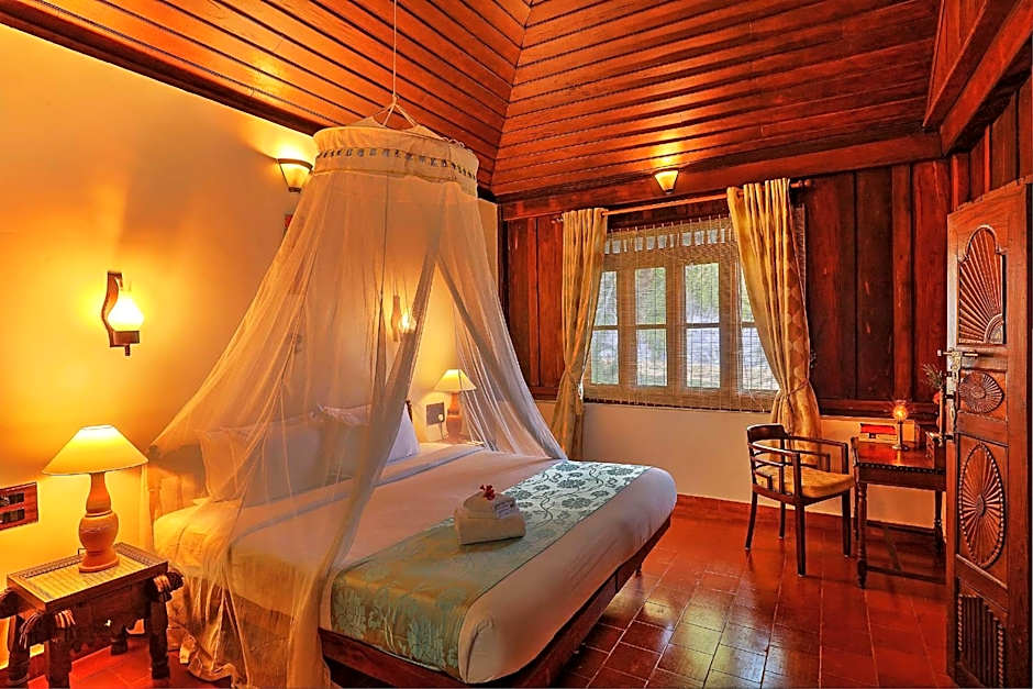 The hotel offers a variety of rooms, including Standard Cottage Rooms, Kerala House Standard Rooms, Special Cottage Rooms, Kerala House Deluxe A/C Rooms, Garden Cottage Rooms, and Cottage with Garden View Rooms. The rooms are all double occupancy and do not allow smoking. The bed sizes range from twin beds to queen size beds, with some rooms also featuring king size beds. The room sizes are generally around 205 sq ft, with the Superior Suite being larger at 355 sq ft.