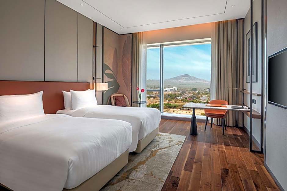 The Radisson Blu Hotel & Spa, Nashik offers Superior rooms with pool view, Superior rooms with hill view, Deluxe rooms, and Deluxe Suites. All rooms have a size of 388 sqft and do not allow smoking. The occupancy of the rooms is 3 adults and 2 children, and the beds available are a combination of 1 double bed and 2 twin beds. The hotel also provides a 15% discount on the spa for all room types.