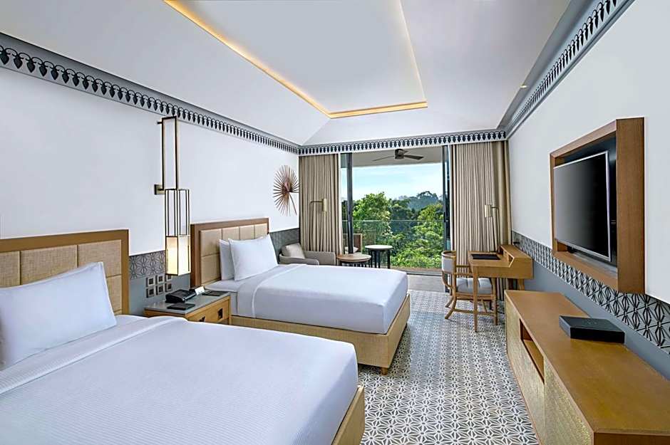 The hotel offers various types of rooms including Twin Executive River View with Balcony, Twin Deluxe Room Forest View With Balcony, Deluxe Twin Room with Garden View and Balcony, Deluxe Suite River View with Balcony, King Executive River View with Balcony, King Deluxe Room River View with Balcony, Deluxe King Room with Garden View and Balcony, and King Deluxe Room Forest View With Balcony. All rooms have a size of 366 sqft, no smoking is allowed, and can accommodate 3 adults and 2 children. The beds in the rooms are either 2 x Twin bed or 1 x King size bed.