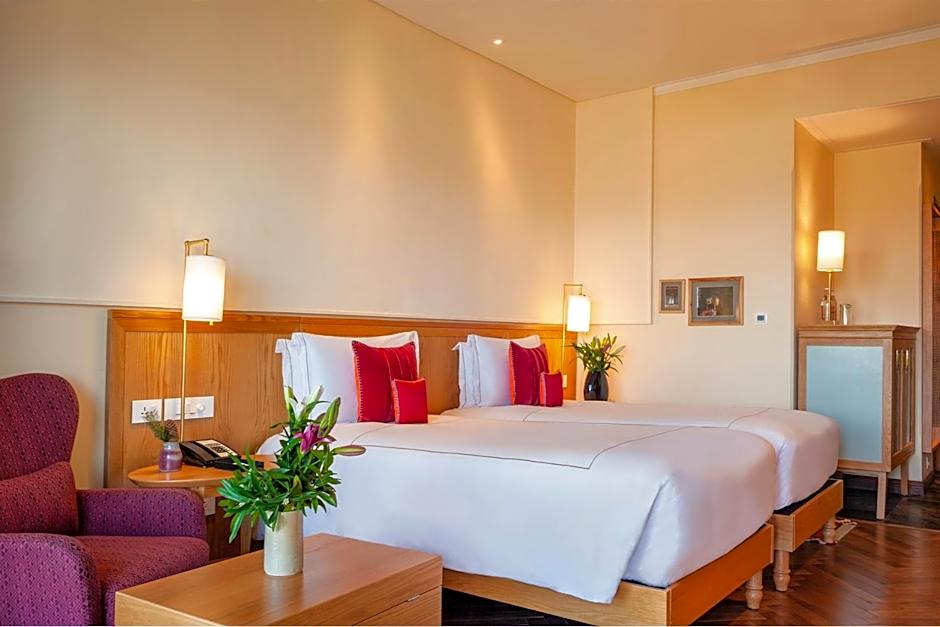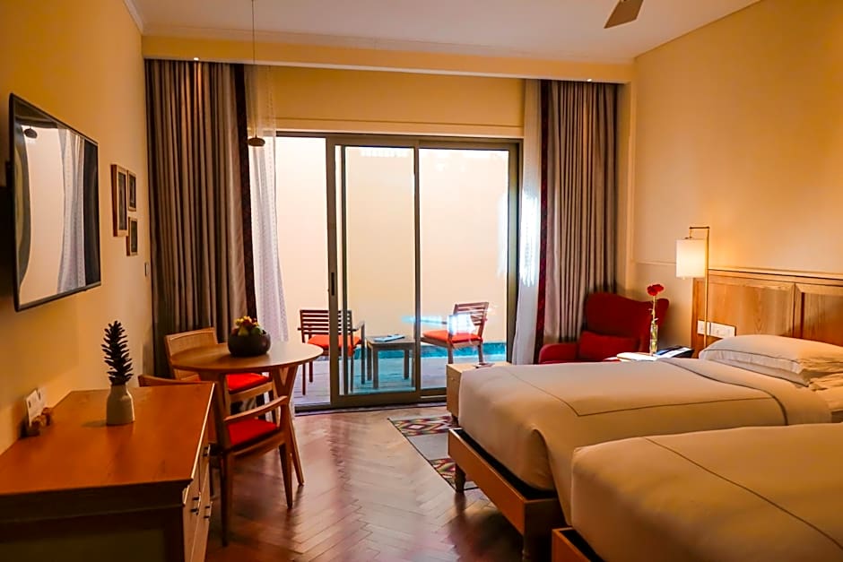 The hotel offers a variety of rooms including Luxury Duplex, Executive Suite, Premium Room, and Deluxe Room, with occupancy ranging from double to quadruple. All rooms are non-smoking and have king or twin-sized beds, with room sizes ranging from 344 sqft to 797 sqft. The accommodations cater to families and couples, providing a range of bed sizes and room types with valley or courtyard views.