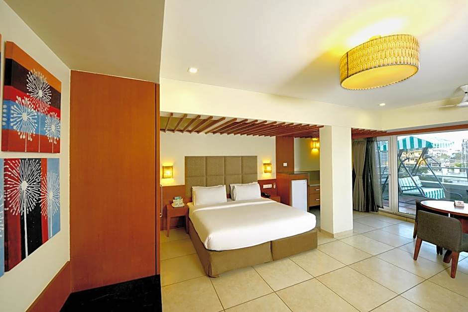 This spacious and bright room features air conditioning and seating area, a flat-screen TV and refrigerator. It has a large balcony with a swing.