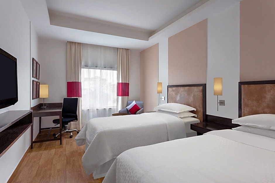 The Four Points by Sheraton Vadodara offers a variety of room types including traditional twin rooms, premier rooms, and premier twin rooms. These rooms range in size from 258 sqft to 291 sqft and can accommodate up to 3 adults. Smoking is not allowed in any of these rooms. The bed sizes vary between twin beds and king-size beds.
