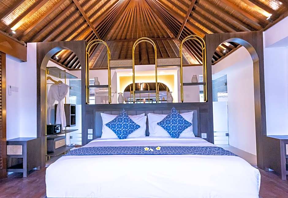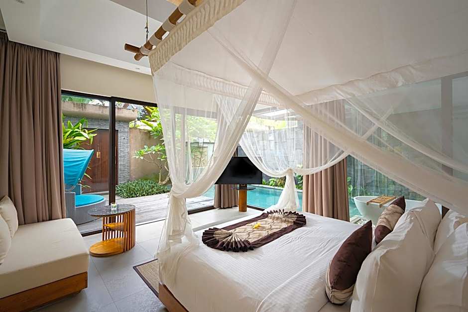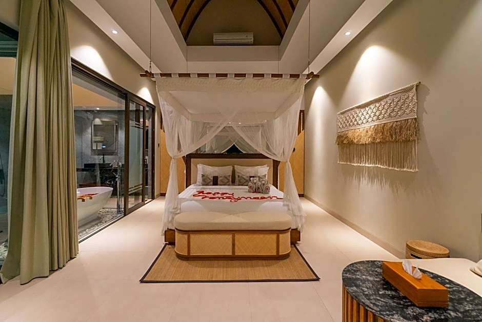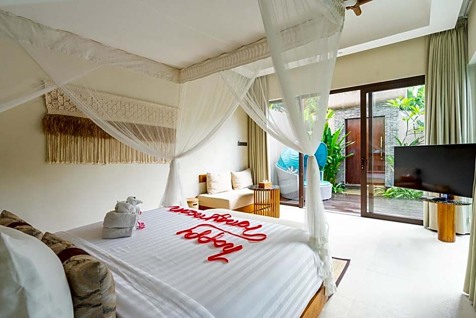 Modern two-bedroom villa with a private plunge pool, open-air living and dining areas, and a well-equipped kitchen. Includes a private balcony with nature views.