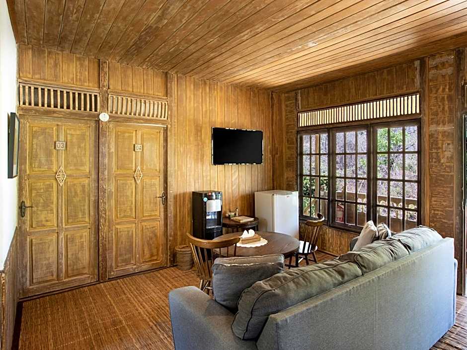 A private, air-conditioned room with semi outdoor bathroom with a hot water shower, a working desk, a wardrobe, and a terrace.