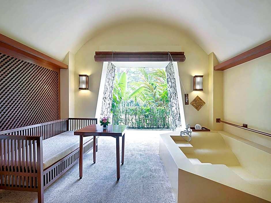 Spacious room with free Wi-Fi, high end amenities, outdoor bathtub and a larger terrace overlooking the garden.