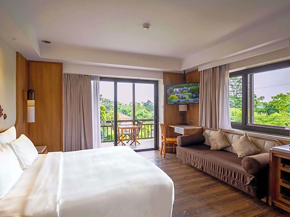 Room with modern décor includes a balcony or terrace facing the tropical garden. A flat-screen TV and a coffee maker are also provided.