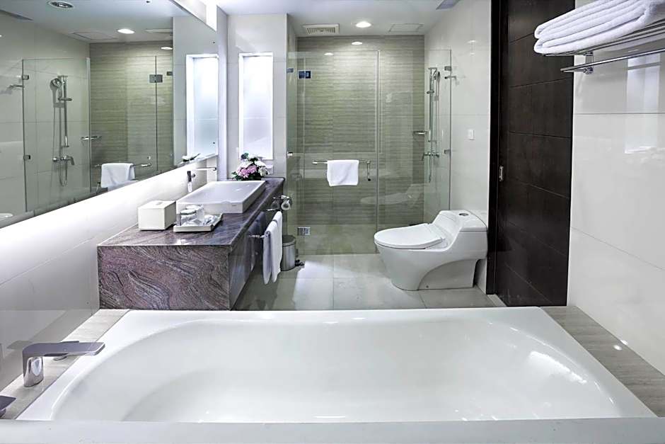 This air-conditioned suite is fitted with a spacious living room, a flat-screen cable TV with international channels, a personal safe, a wardrobe, and a mini-bar. There is also an private bathroom featuring with a free-standing bath tub and a separate walk-in shower. Bathrobes and slippers are provided. Complimentary WiFi is provided.
