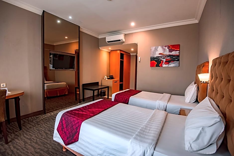 The Mirah Bogor Hotel offers a variety of rooms including Superior Double and Twin Rooms, Deluxe Double and Twin Rooms, as well as Deluxe Rooms with Balcony. All rooms are non-smoking, accommodating 2 adults and 1 child. Bed sizes range from Queen size to Twin beds, with room sizes averaging around 269-280 sqft.