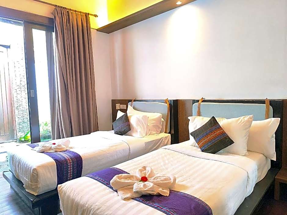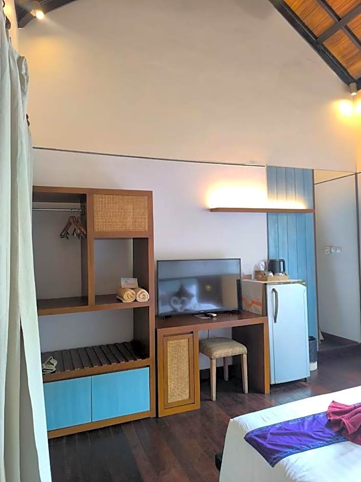 A cozy and air-conditioned room featuring warm and calming colors, which overlooks the garden. It is well equipped with a TV, a safe and a mini-bar. It has a private patio and modern bathroom fitted with an outdoor hot and cold shower facility and free toiletries.