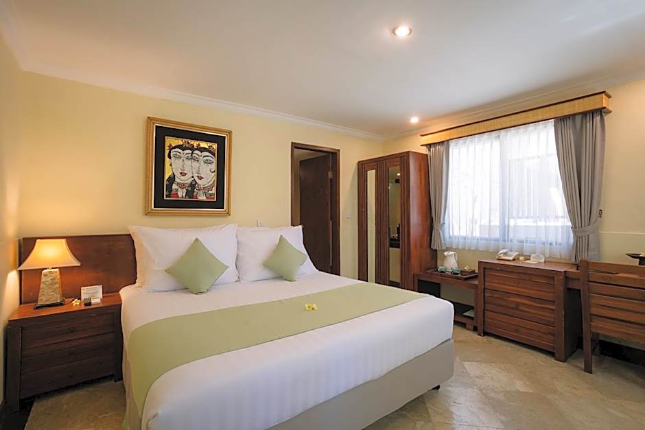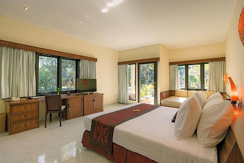 Spacious room with a semi-open bathroom and a small corner garden, featuring sleek modern interiors with traditional Indonesian amenities. It also has a large furnished terrace and large indoor bathroom. Guests can enjoy views of the tropical garden and the room is located just steps away from the Hidden Pool and Bar. This room type can accommodate an extra bed.